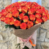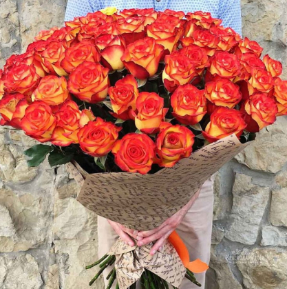 На фото - 101 оранжевая роза. В составе букета: 101 оранжевая роза 60см, лента атлас 2,5 см. С помощью калькулятора можно выбрать высоту роз 50 - 70см.