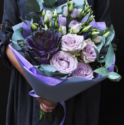 Букет в сиреневых цветах, собранный из брасики, лизиантусов и роз. Добавлены зелень эвкалипта и упаковка.