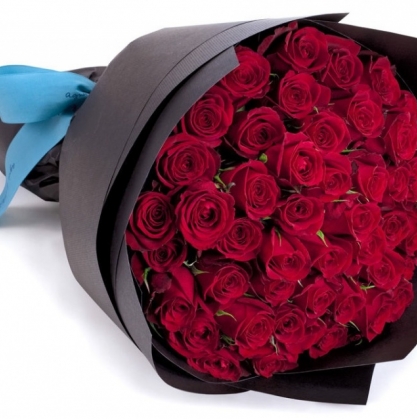 Стильный букет из 51 красной розы в черной крафт бумаге.