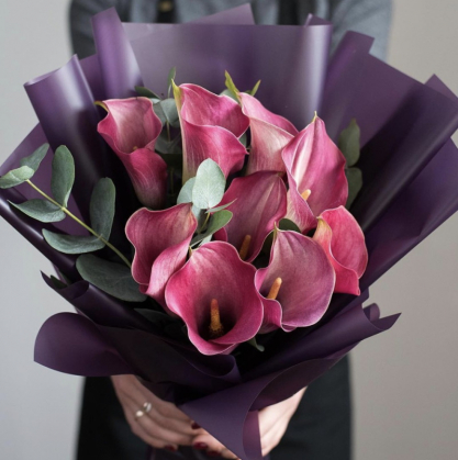 Букет из 9 розовых калл с добавлением эвкалипта в стильной упаковке
