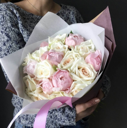 Букет из розовых пионов и белых роз в стильной упаковке