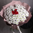Букет хризантем с красными розами в центре