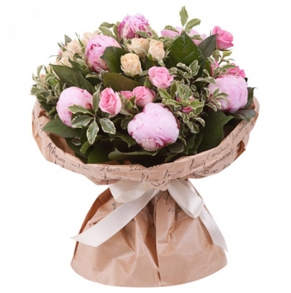 Букет из пионов и кустовыз роз с добавлением листьев салала и питтоспорума в стильной крафтовой упаковке