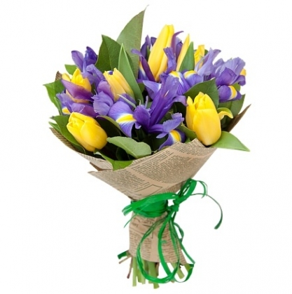 Букет из тюльпанов и ирисов с добавлением зелени