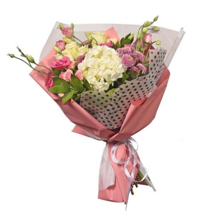 Букет из гортнзий, роз, кустовых хризантем, эустомы с добавлением рускуса в красивой упаковке