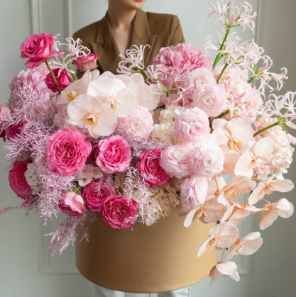 Коробка из пионовидных роз, ранункулюсов, орхидей | Купить в Сумгаите