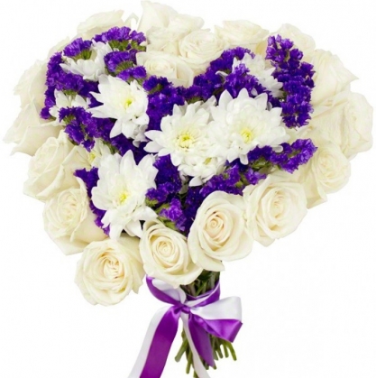 Букет сердцем из роз, хризантем и статицы