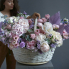 Корзина из пионов, гвоздик, гортензий, твидии, эустомы и статицы, с добавлением суккулентов, клематисов и пальмы