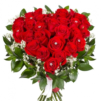 Букет красных роз в виде сердца с использованием проволочного каркаса. Для придания вышности букет украшен гипсофилой и зеленью.
