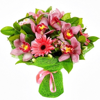 Яркий букет из цветков орхидеи и гербер с добавлением зелени в натуральной упаковке
