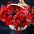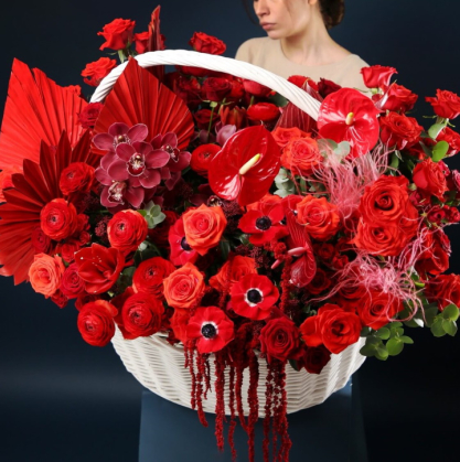 Корзина из роз, ранункулюсов, орхидей, антуриумов, анемонов и амарансусов с добавлением пальмы, эвкалипта и куркумы