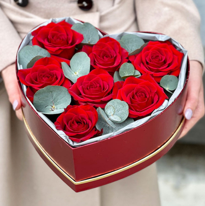 Коробка в виде сердца с розами и эвкалиптом