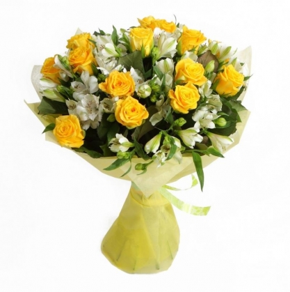 Композиция из желтых роз и белых альстромерий способна подарить только самые теплые чувства!
