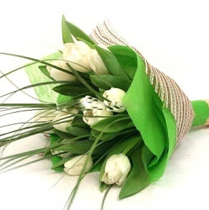 Нежный букет из белых тюльпанов с добавлением зелени берграсса.