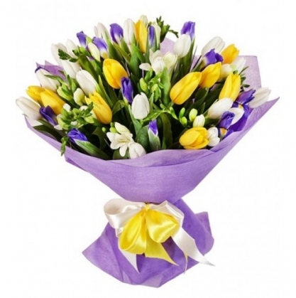 Букет "Три желания" из тюльпанов, ирисов и фрезии | Купить в Сумгаите