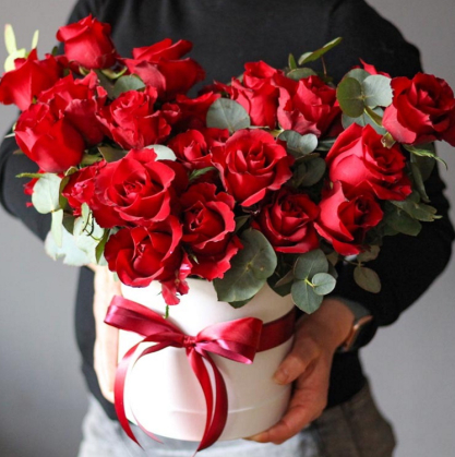 Безумно красивая и яркая композиция. Шляпная коробка с красными кустовыми розами и эвкалиптом Цинерия. На дне коробочки находится флористическая губка, поэтому цветы долгое время будут радовать своего получателя.